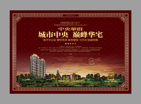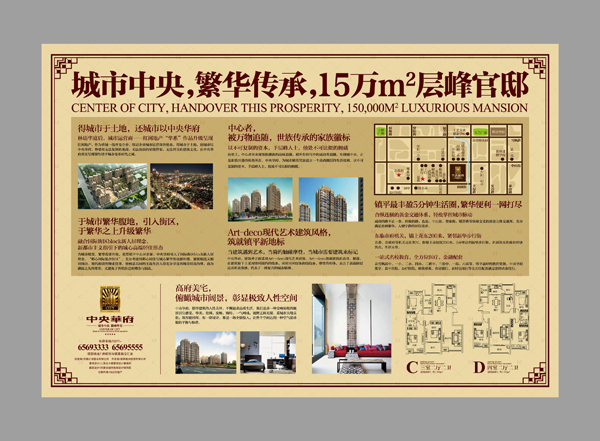 中央華府,城市中心區,繁華傳承,城市破繭之作,15萬㎡層峰官邸,尊處市府東臨,鎮菩路中央統御區位,art—deco現代藝術建筑立面,14棟高尚建筑群展現地標風姿,融合現代高尚人居、國際名店商業街區形態、高端藝術會所等多種現代人居物業形態,使城市層峰階層,據一華府,完成百年家徽的傳承。
