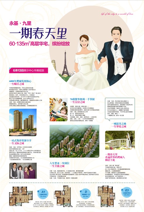 永基九里項目總占地面積近1000畝,規劃建筑面積150萬㎡,分為9期開發,一期“春天里”榮耀面市,占地130畝,建筑面積33萬㎡,坐落于九里山脈南坡,由13棟簡歐設計的高層住宅組成,總戶數3200戶,戶型面積67㎡-135㎡,一期“春天里”利用自然的坡地地形,結合居住特性打純天然的坡地景觀園林住宅,水系環繞,綠樹叢蔭讓您品味城市喧囂之外的舒適生活,巨資打造獨特的景觀園林,全區硬質鋪裝,獨有10米高流瀑景觀,外立面采用真石漆,精裝雙電梯入戶大堂,戶型全明設計,千畝國際級城市綜合體 ,開啟鷹城人居新標準。