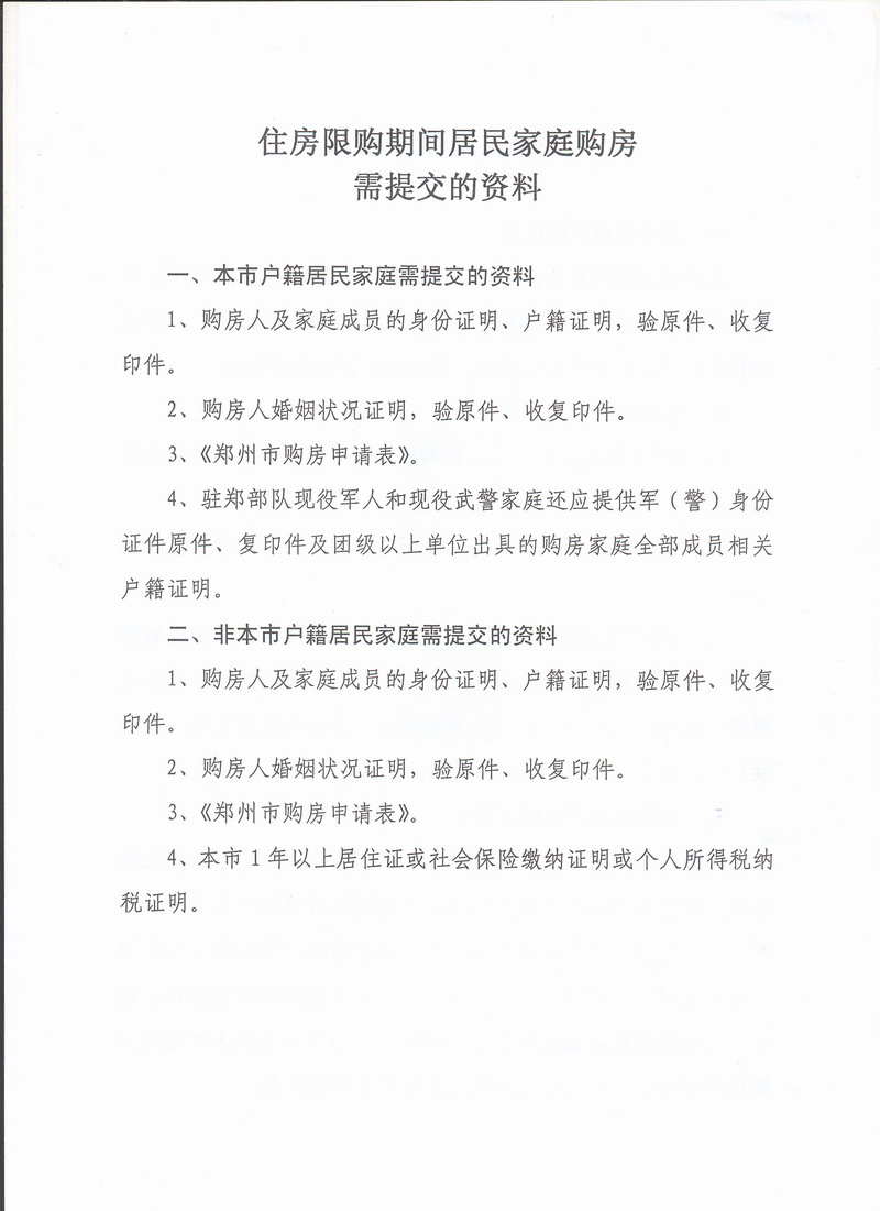 鄭州住房限購期間居民家庭購房須提交的資料