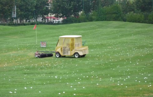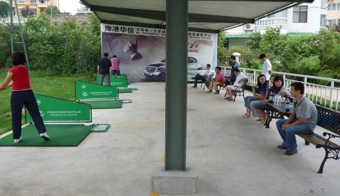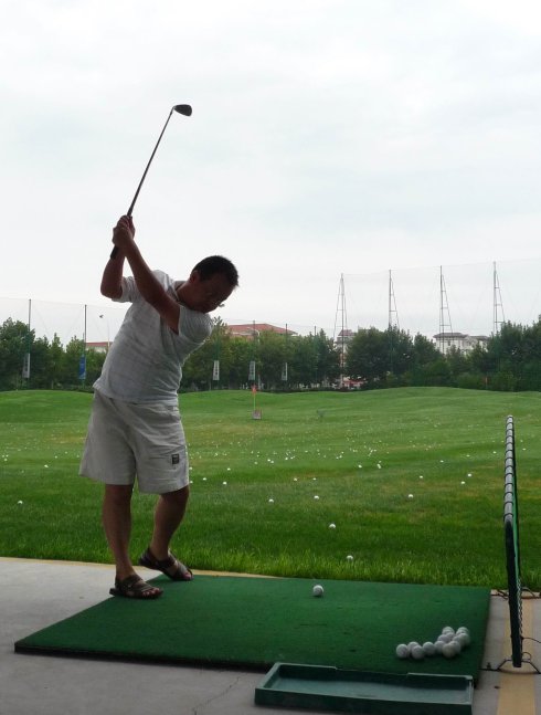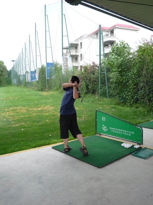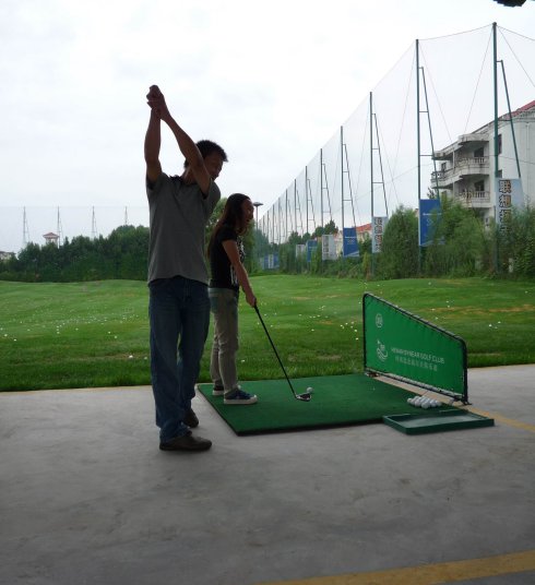 周六早上8點在約定的地方集合后,向目的地——思念果嶺山水進發(fā)。雖然天下著小雨,大家仍然興致勃勃,一路上有說有笑。車行出市區(qū)后,我們被路旁大片大片的路色植被吸引,雨后的草香伴著泥土的芬芳令人陶醉。天公作美路上還下著小雨,等我們一到高爾夫練習場天立馬見晴。大家一開始摸不著門道,經(jīng)過幾輪之后漸漸熟悉了