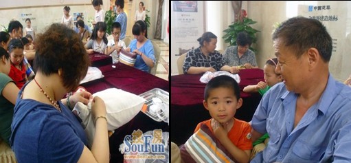 參加活動的既有熟練針線的中老年人,也有躍躍欲試的年輕朋友,每個人都使出渾身解數,使用各種巧妙的針法和快速打結的方法,爭取拔得頭籌獲大獎。之前在中建一德壹號認籌的小李專程帶著母親來參加此次活動,“我是周末沒事兒陪我媽來的,抱枕DIY活動很有意義,很貼近我們的生活,抱枕也很實用……我們就是沖著第一來的,祝我勇奪第一!”