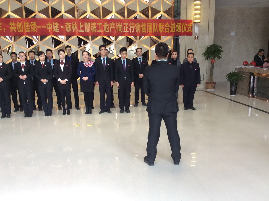 上午9:30分,中建森林上郡——尚正行、精工地產銷售團隊聯合進場儀式正式開始,所有與會人員在售樓部大廳整齊列隊,主持人首先致開場白,隆重介紹歡迎各位領導嘉賓的到來,并隆重介紹了與會的各位嘉賓、領導。