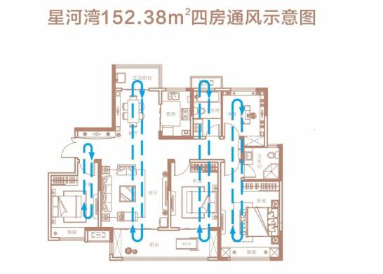 我們可以看到星河灣152.38㎡四房,南北通透,南向面寬大,而且進深短,開窗條件下基本可以實現無死角空氣對流,室內時刻保持空氣換新。