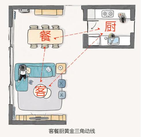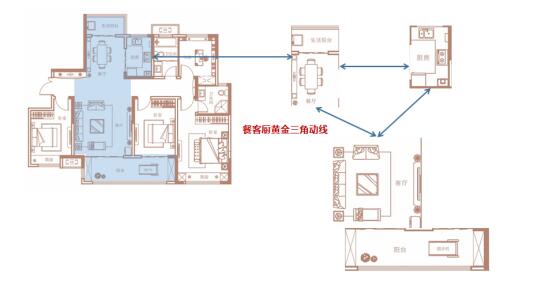 同時家庭公共活動空間形成黃金三角區(qū)域,客廳作為全家人共聚的場所,是一個家的核心,而餐廳是一家人坐下來好好吃飯的場所,是家人難得的團聚。客餐廚的完美互動關系,正是對一家人最美好的詮釋。